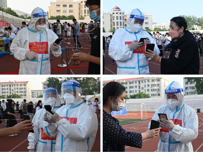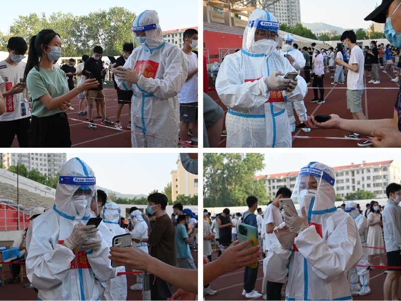 作为新入职青年教师,纪兆圻已经是第二次跟随其他党员老师一同参加志愿者行动。“炎炎烈日下,我看到前辈们义无反顾的穿上防护服,加入到核酸检测志愿服务中,汗水湿透了他们的衣服,但却做到了与医务人员的无缝对接。他们的精神深深地打动和激励着我。”张兆营老师先前多次担任核酸检测志愿者,今天由于人数原因,作为场边指导服务人员,全程陪同核酸检测。“今天虽然没能‘披挂上阵’,可是作为一个核酸检测志愿服务的熟练工,为全副武装的志愿者们,尤其是为新手志愿者们服务的感觉也棒棒的!作为场外辅助人员,今天有幸可以站到台阶上纵观全场,看到一列列整齐的学生队伍,以及队伍中忙忙碌碌的大白们,场面甚是震撼。相信我们众志成城,团结一心,疫情终会消散!”